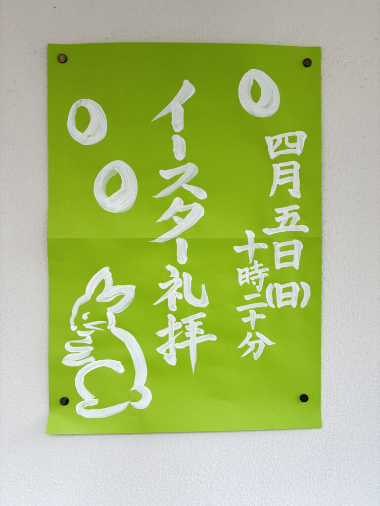 イースターを待ちつつ 2026 3/31 牧師のブログ 2026年3月31日 4月5日はイースターです。教会学校ではイースターエッグのオーナメント作りをしました。教会ではキリストのご復活を記念して、大人も子どもも一緒に楽しいお祝いをします。 牧師のブログ 2026年3月29日礼拝音源はこちら 関連記事 チューリップが飾られて 2026年3月15日 懐かしい説教者を迎えて 2026年3月1日 春が来ました 2026年2月27日 2月15日の聖壇の花 2026年2月16日 床のメンテナンス 2026年2月16日 雪が降りました 2026年2月8日 クリスマスを迎えて 2025年12月25日 サンタクロースが来てくれました 2025年12月18日
